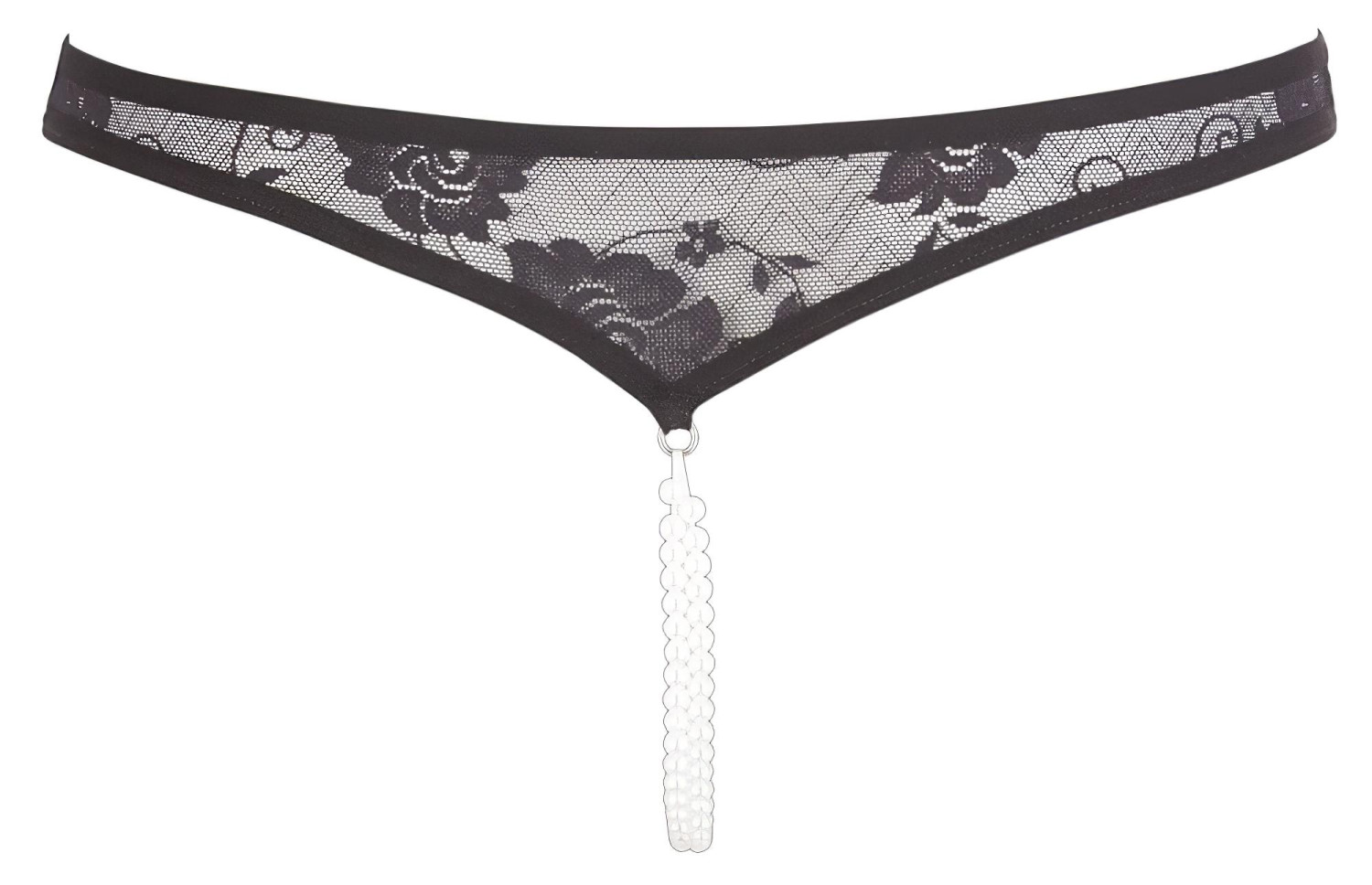 • 1 komad crnog čipkanog tanga sa perlama, otvorenog dizajna.