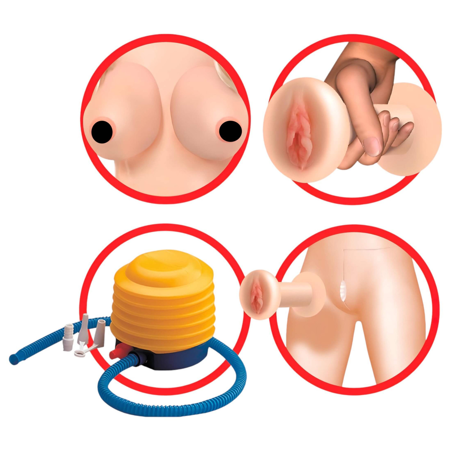 • Naduvavanje do veličine realne osobe, oble i bujne grudi, rotirajuće ruke